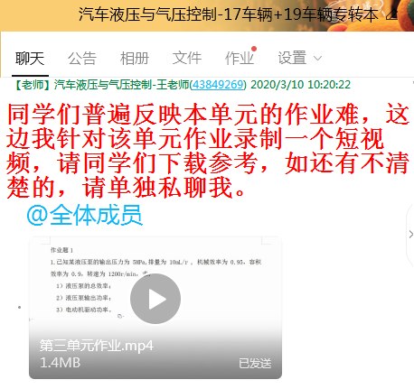 由于线上教学,和学生互动不方便,以及学生在学习过程中遇到问题如何及时解答。针对这些问题,我采取录制小视频的方式。针对单元作业中同学们普遍认为难的题目,录制小视频进行详细讲解;针对课程中的难点和重点,我录制10分钟左右的教学视频传给同学,作为课程学习的补充材料。如图5和图6为利用课程QQ群发布录制的小视频,针对单元作业中的难题进行集中答疑以及补充重难知识点资料。这种教学方式受到了同学们的一致好评,他们可以利用课后时间反复观看,加强对知识点的理解。