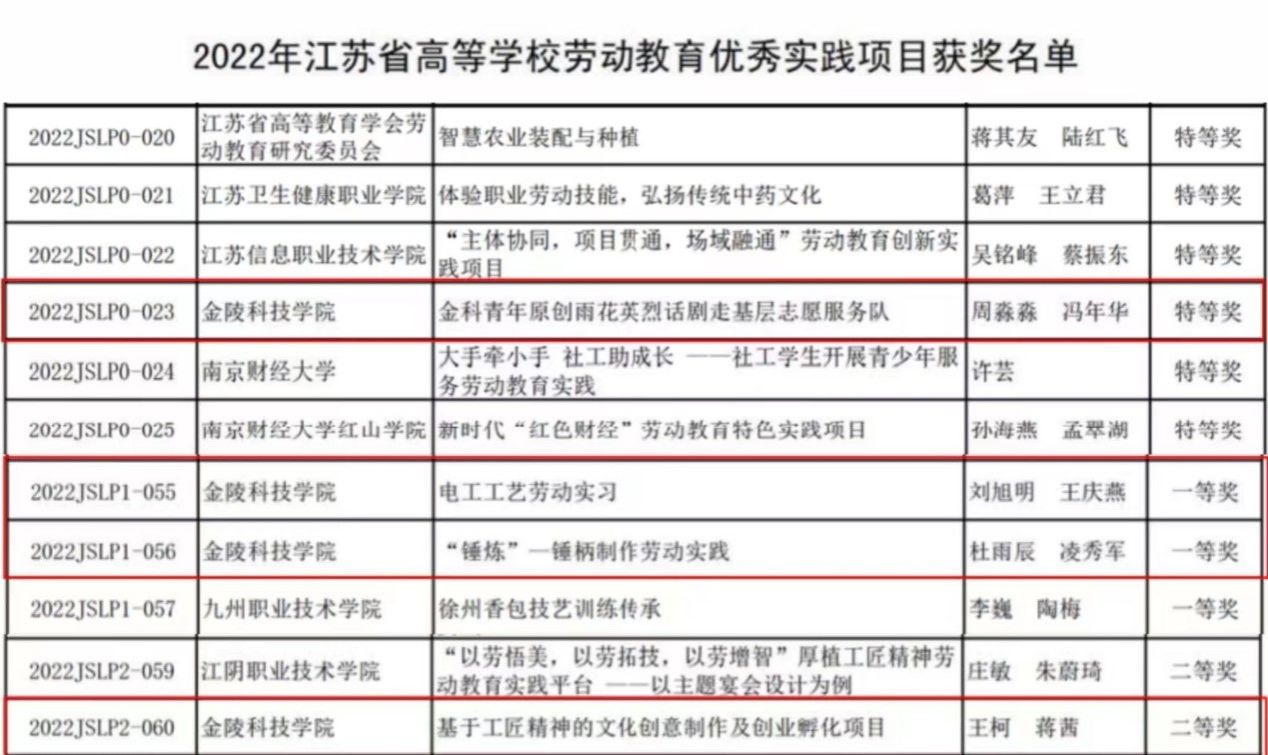 根据《关于公布2022年江苏省高等学校劳动教育优秀实践项目评选结果的通知》(苏高教会﹝2023﹞5号)文件,我校择优报送的4个项目全部获奖,其中绿帽社 的《电工工艺劳动实习》《“锤炼”——锤柄制作劳动实践》两个项目获得一等奖。