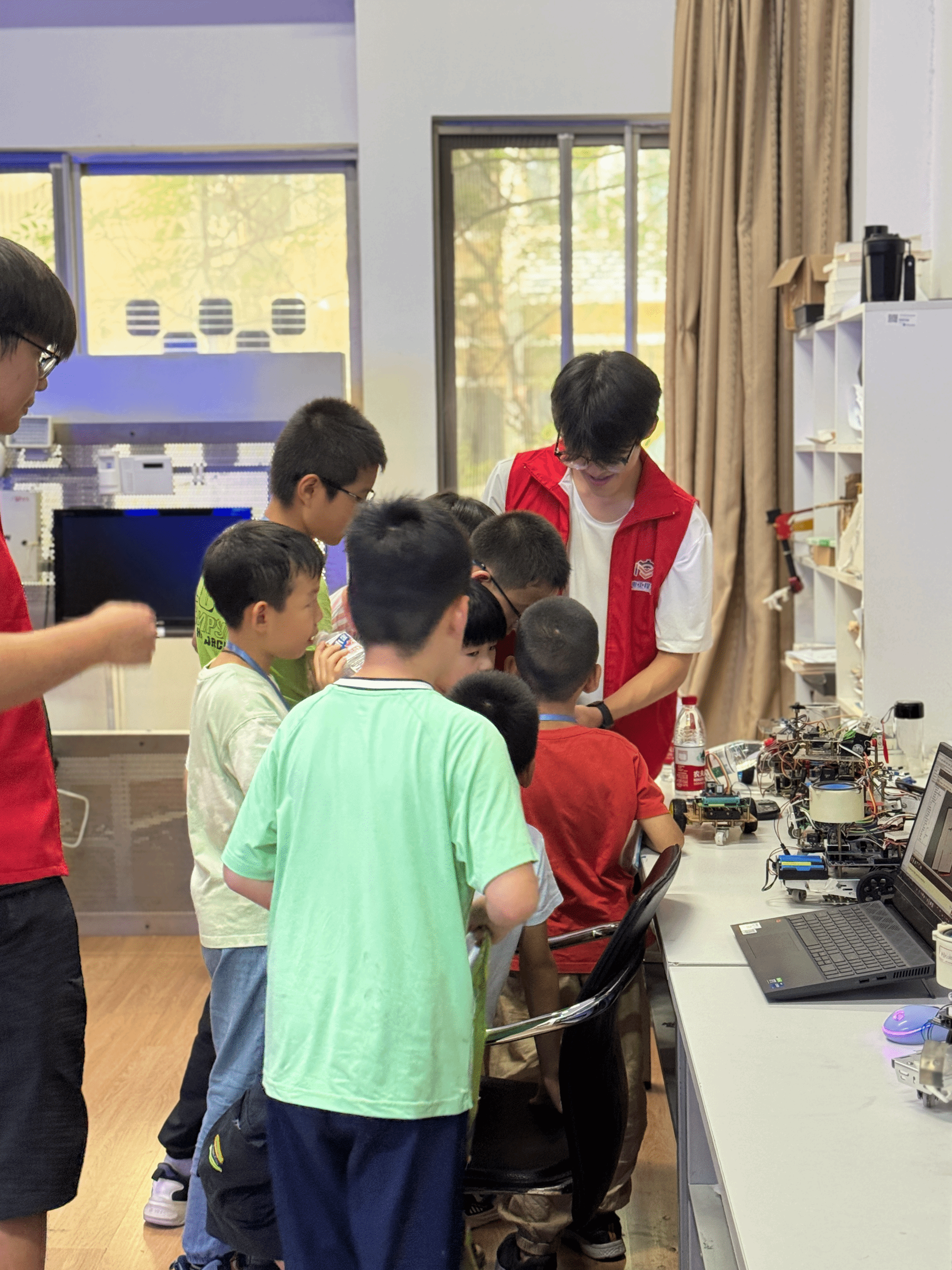 承办了“科创奇妙游”项目。本次托管活动为教工子女带来沉浸式科技体验——科创团队成员将带领孩子走进实验室,体验嵌入式、ROS等技术的实际应用,参观智能硬件、机器人等核心项目成果,同时分享科创竞赛经验与学习心得,激发孩子们对科技的探索热情。活动内容设计精心,安排动静结合,组织安全有序,赢得了全校教职工的充分信任和肯定,同时也深受孩子们的喜爱。学校“服务+教育+互助”模式的暑期爱心托管活动不仅是“为教职工办实事”的暖心实践,更是用爱与智慧为孩子们编织起的成长摇篮。