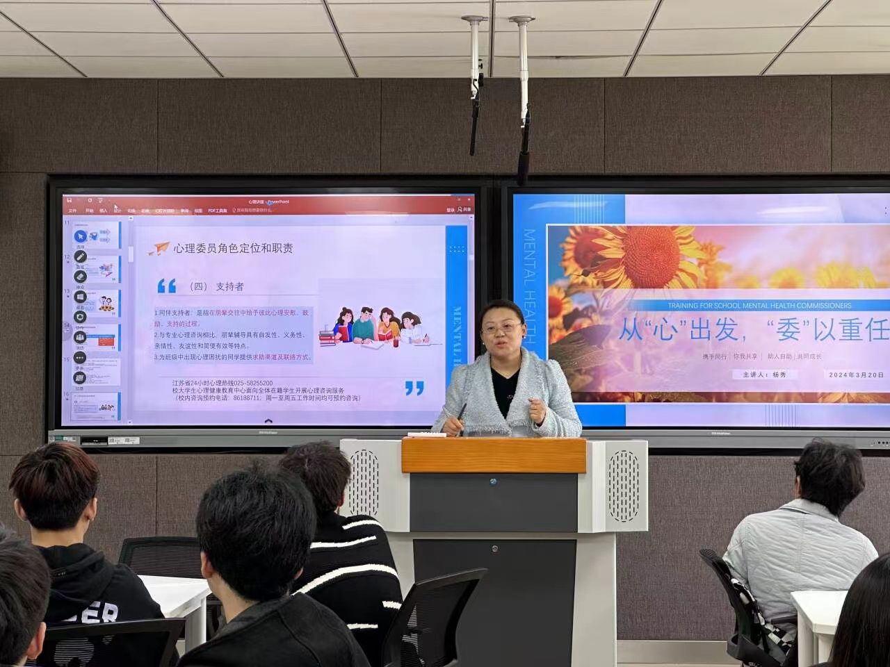 在工科楼C514开展了一场主题为“从心出发,委以重任”的主题心理讲座,院党委副书记张蓉出席,由国家二级心理咨询师、辅导员杨秀老师主讲,全体心理委员、心理协会成员参加。