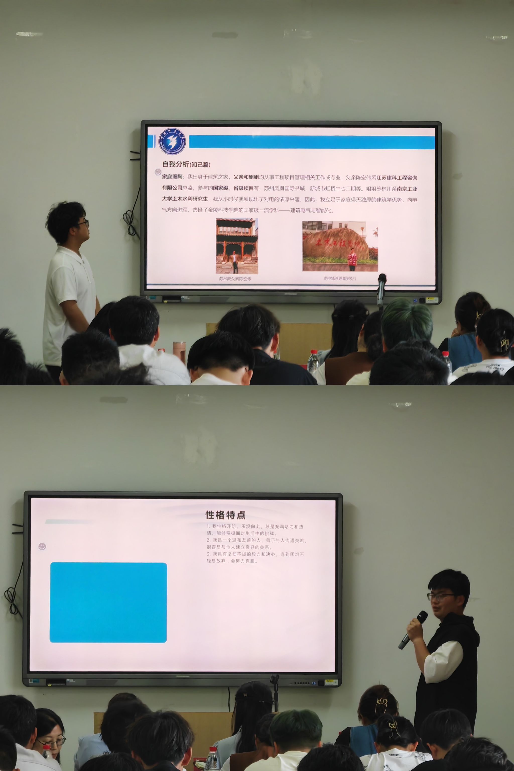 在工科楼C504举办大学生职业规划大赛院级选拔赛。本次大赛邀请学院党委副书记张蓉、南京中竞科智能科技有限公司总经理秘书、项目经理盛娟以及全体辅导员担任评委。70余名学生代表观摩了本次比赛。