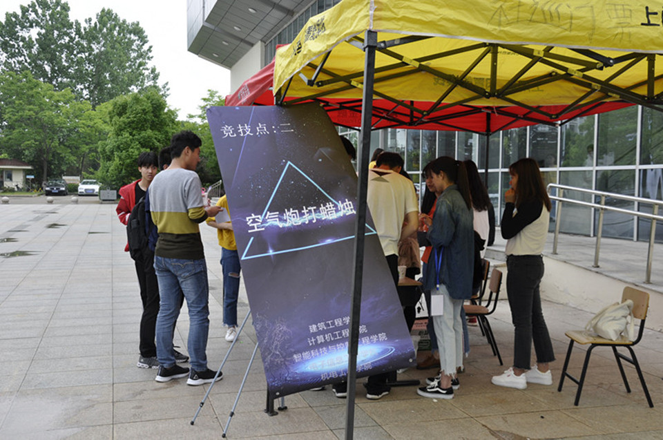 、计算机工程学院、建筑工程学院、电子信息工程学院和智能科学与控制工程学院共同举办。比赛在校南区教学楼中间空地举行,参赛的19组选手早早地就来到了场地进行赛前准备。下午2点半,比赛准时开始。参赛者需要根据主办方提供的材料,在不同的地点完成拼装纸飞机、空气炮打蜡烛、水火箭、喷漆快艇、磁力小车、立罐6个项目。每个项目都趣味十足,具有很强的挑战性。选手们相互配合,迎难而上,出错时沉着冷静,认真分析;成功时不骄不躁,稳步前进。最后,绿帽社