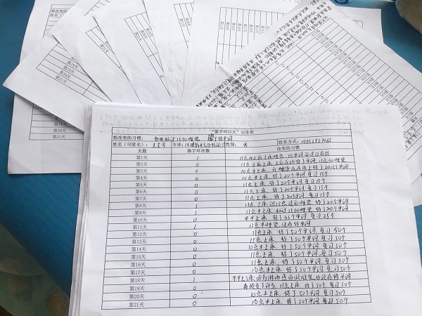 给报名的900多名同学每人发放了一个紫手环和记录表。参与的同学都写了一个自己想要改变的坏习惯。比如,不抱怨、上课听课不走神、不熬夜等。发现自己没有做到就将手环从一只手腕换到另一只手腕上,并在记录表上记录下一天换手环的次数。