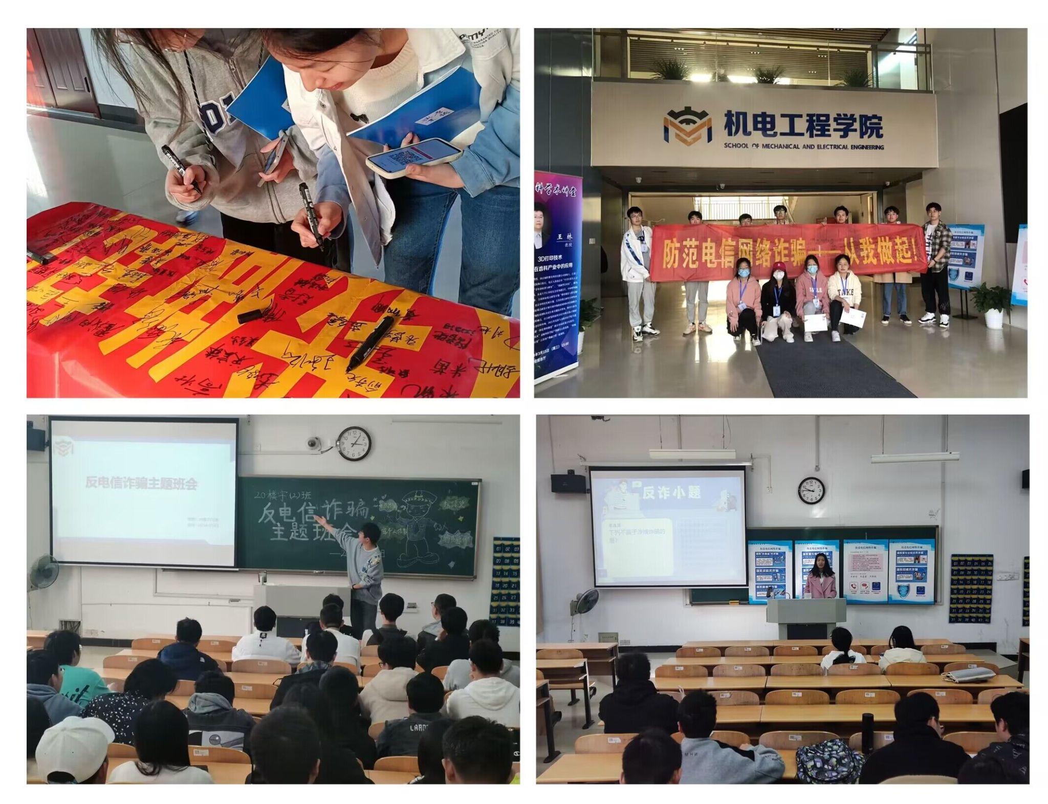 为进一步提高学生对电信网络诈骗的识别和防范能力,切实减少校园电信诈骗案件的发生,扣好新学期第一粒“安全扣子”。机电学院于3月1日-3月31日期间,通过多种形式全方位、多层次开展“防范电信网络诈骗主题宣传教育月”活动,为全体学生上好反诈“开学第一课”。