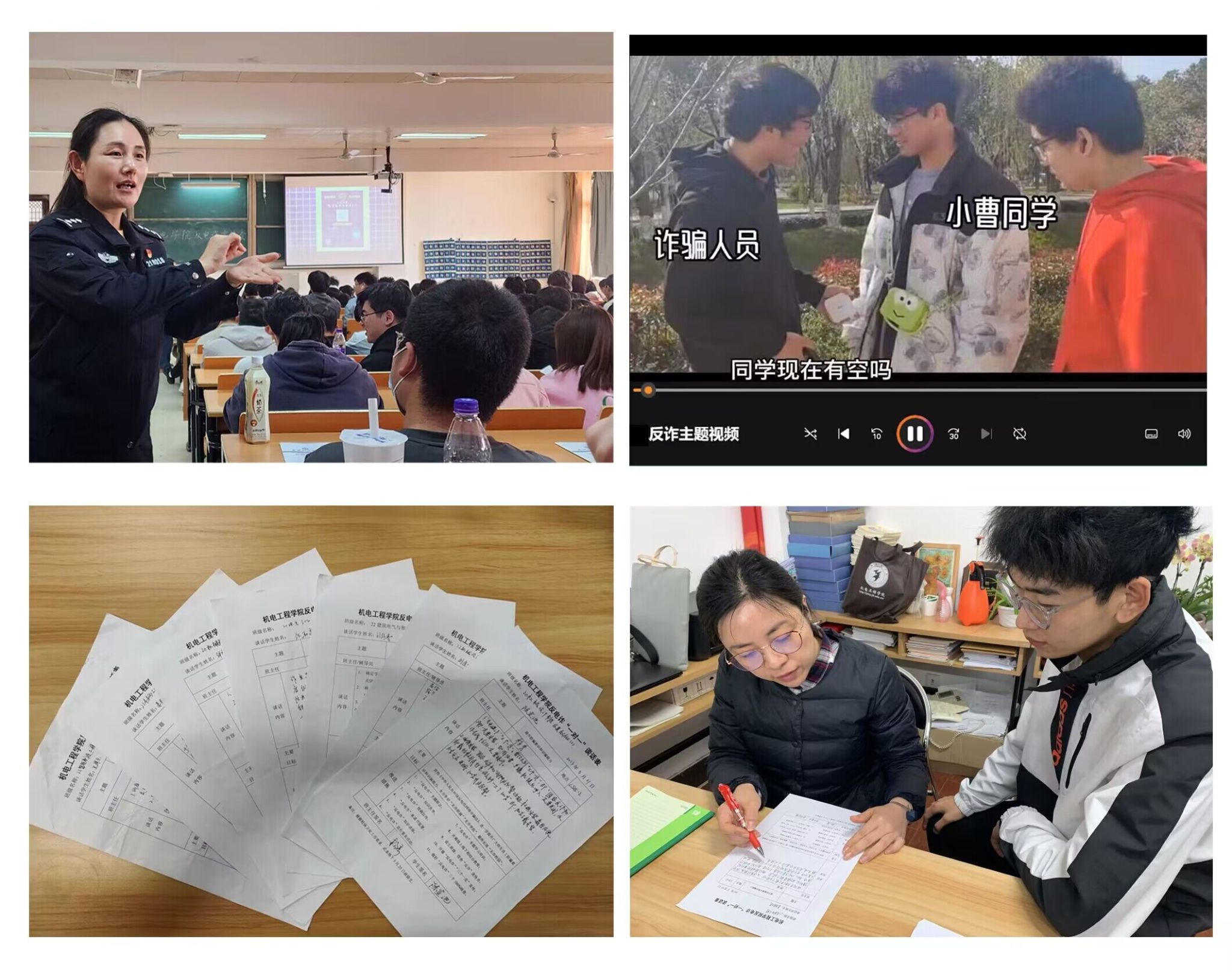 层层联动,筑牢防骗“防火墙”。坚持特色做法,精准发力施策。实行宿舍反诈宣传员聘任制,开展“一对一”宿舍精准宣传服务。在班级建立班长、班级安全员、宿舍反诈宣传员为主体的反诈工作宣传组。签署“反电诈”承诺书,开展反电诈“三个一定”宣传,做好“反电诈”三个100%核查,建立信息台账。重点做实全院1831名学生“反电诈”“一对一”谈话,谈话完成率100%,全覆盖建立个人谈话档案。开展“反电诈”短视频征集评选活动,组织“反电诈”宣传签名活动。举办“反电诈”知识竞赛,通过走访排查、发放调查问卷深入开展反诈骗学习。