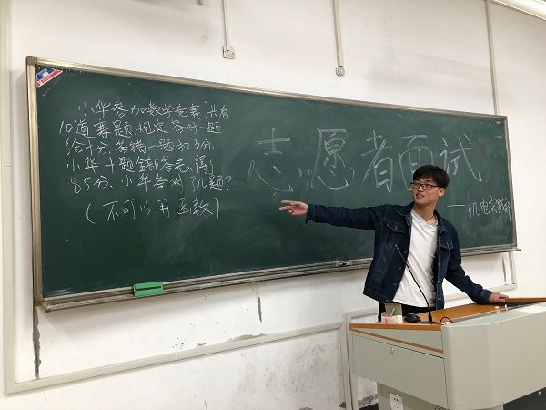 晚6点半,面试正式开始,由院学生会实践部部长付文龙主持。志愿者纳新面试流程主要分为自我介绍、提问互动和现场习题讲解三个环节。为了遴选到更优秀的志愿者,绿帽社