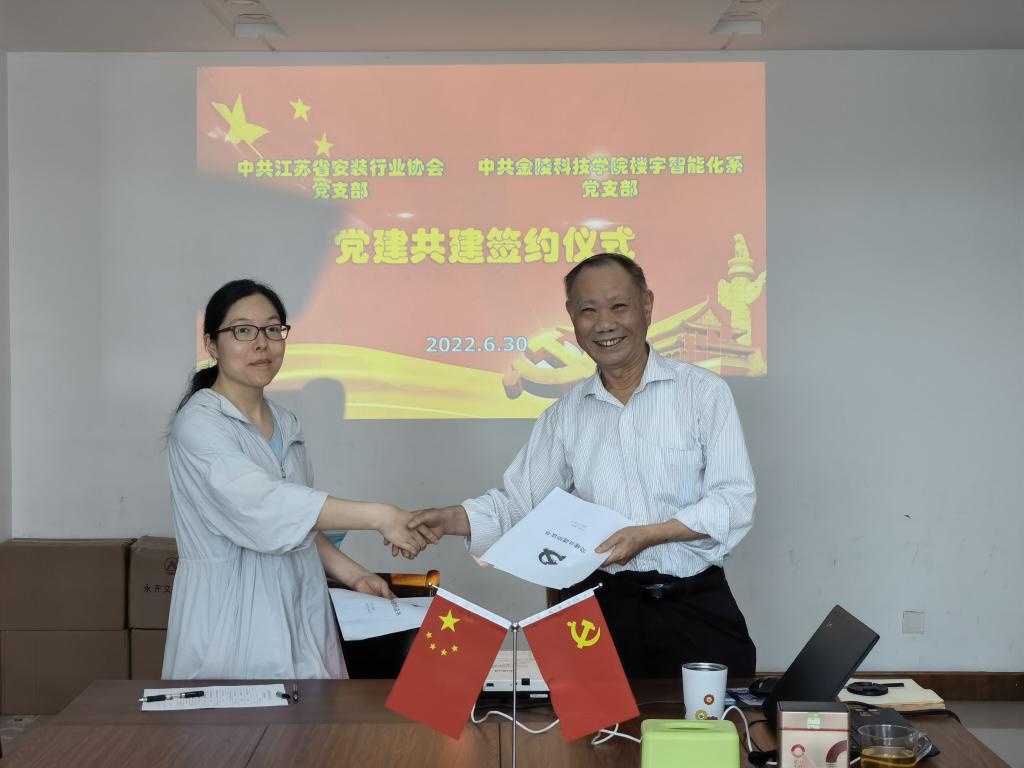楼宇智能化系教师党支部与江苏省安装行业协会党支部在江苏省安装行业协会会议室签订党建共建协议,党支部书记牟淑志、主任牟福元、鞠全勇教授参加了签约仪式。
